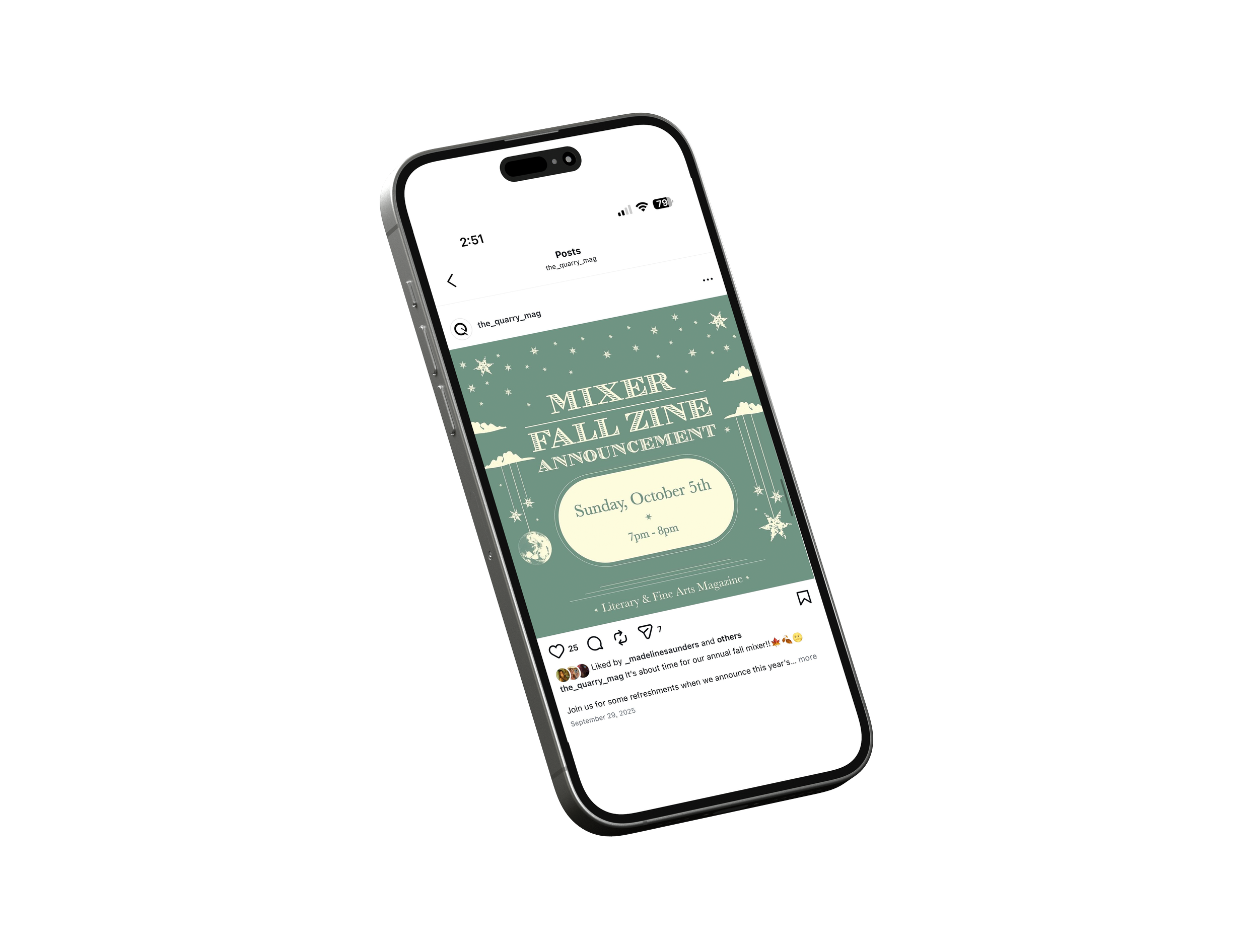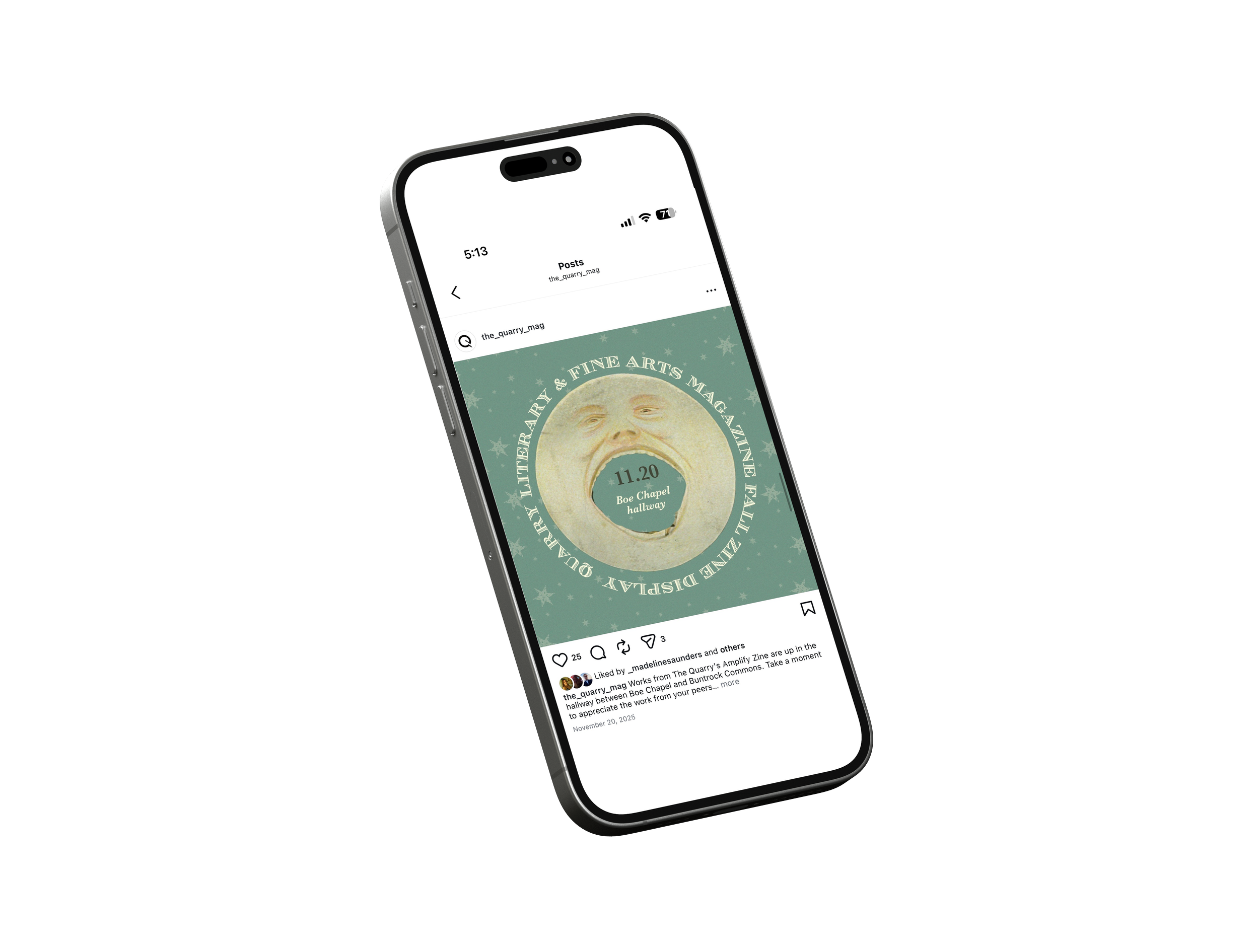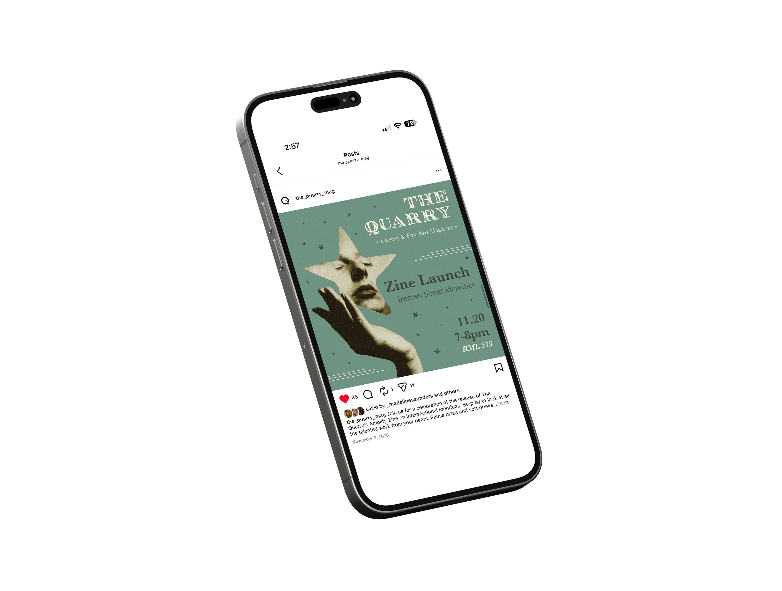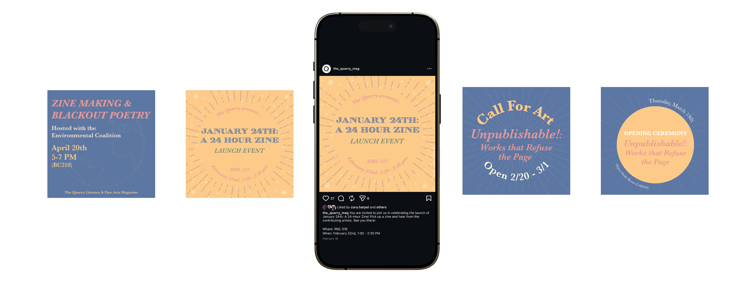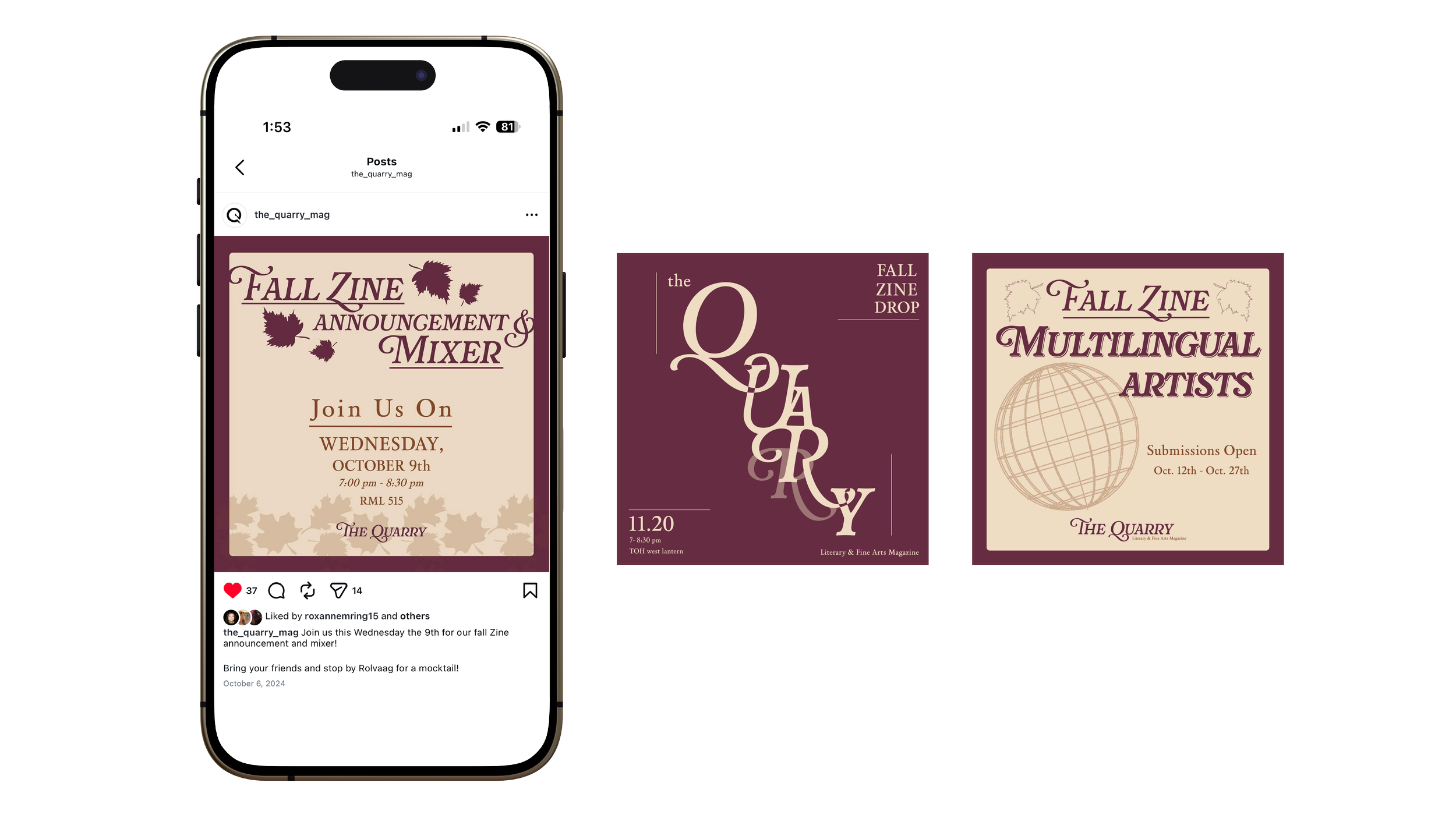 The Quarry Literary & Fine Arts Magazine is St. Olaf College’s oldest campus organization that produces a yearly fall zine and spring magazine. As the Media Editor, I oversee and manage The Quarry’s social media presence and marketing initiatives. I collaborate with fellow editors during the artwork selection process for the Zine and actively promote events through various digital platforms. My responsibilities include contributing to branding and merchandise development, designing promotional materials such as posters for submission periods, events, and exhibits, and helping to craft the annual theme and visual identity. I also work closely with the Layout Editor to ensure stylistic consistency between the magazine and social media content.