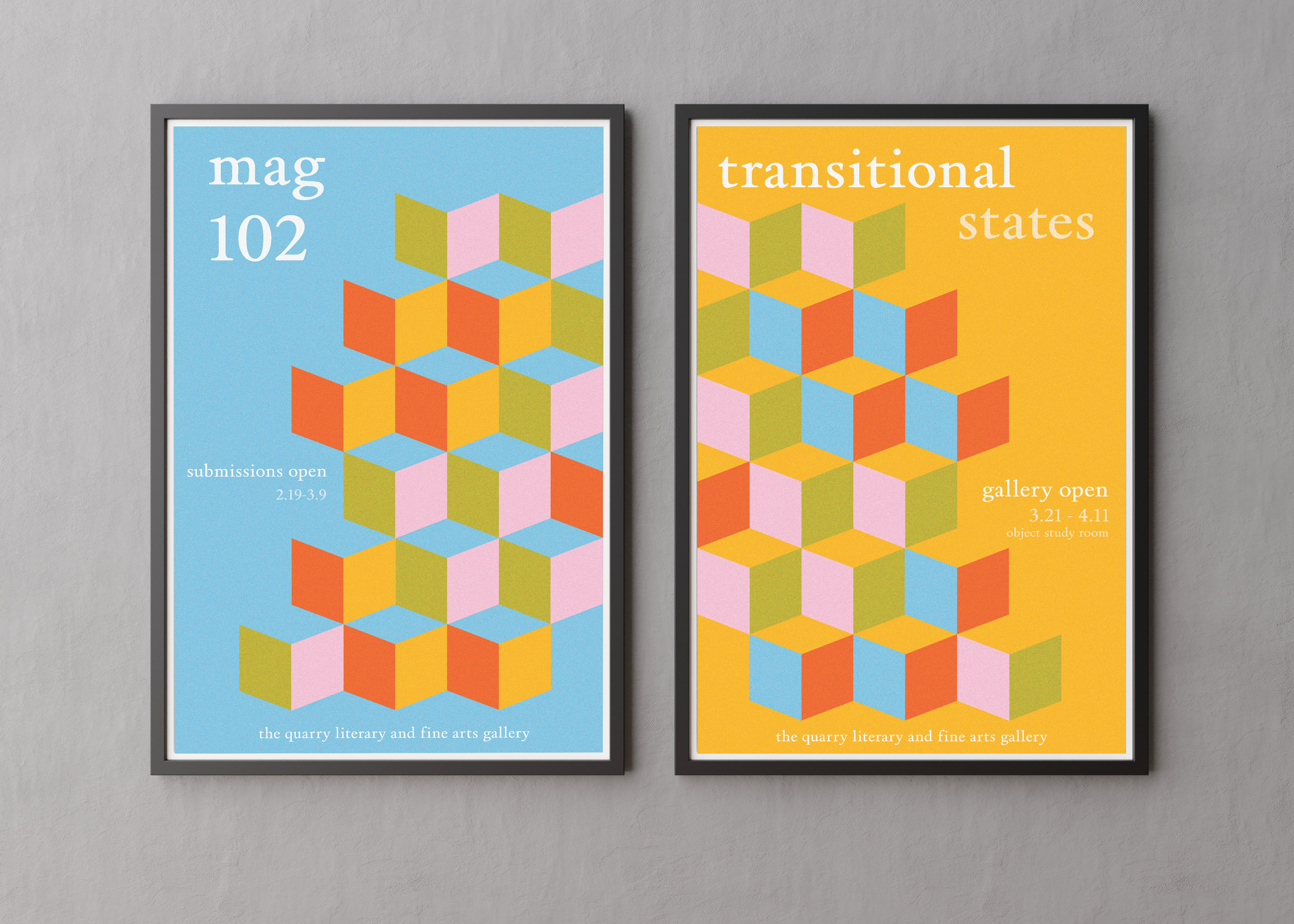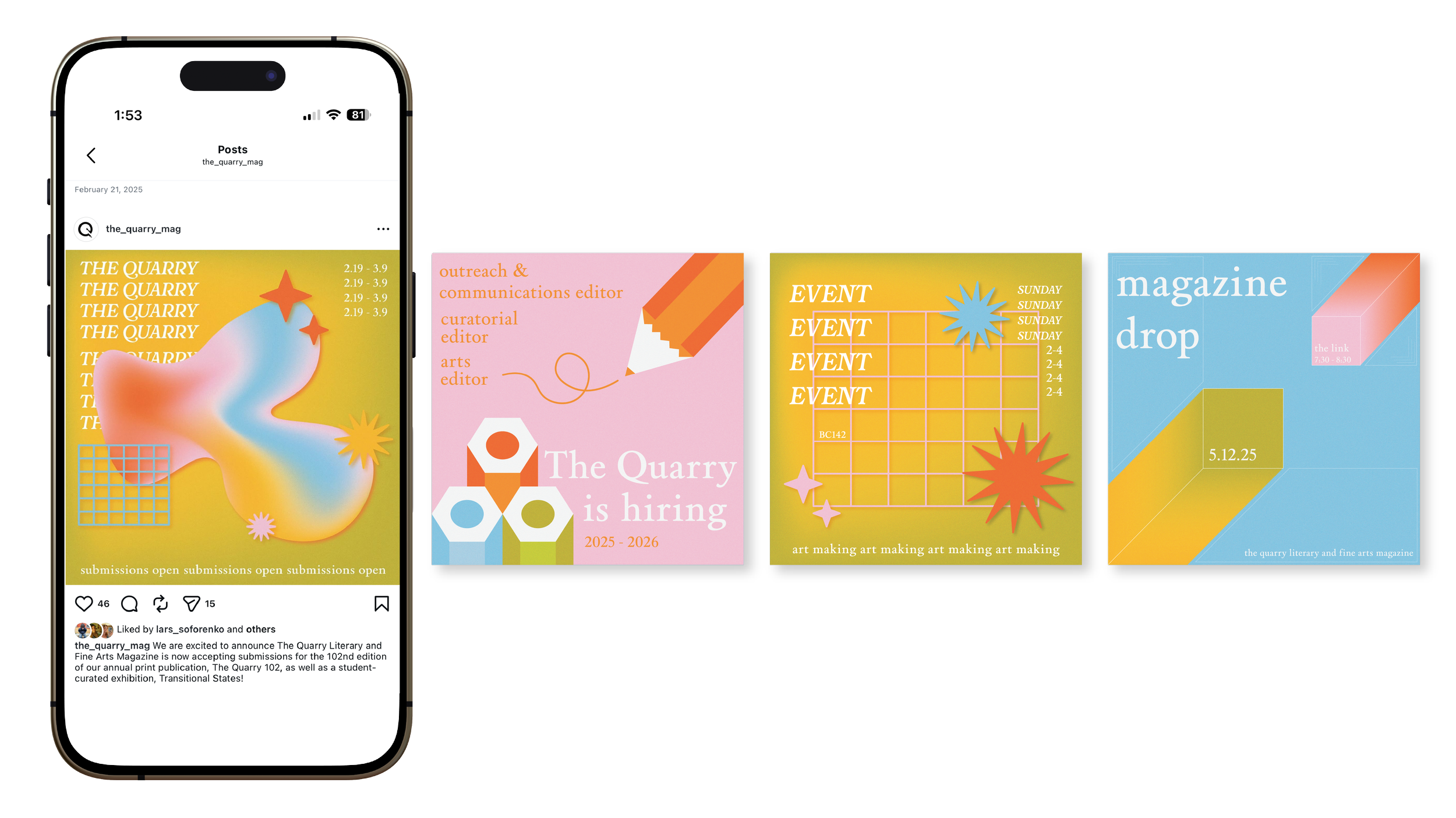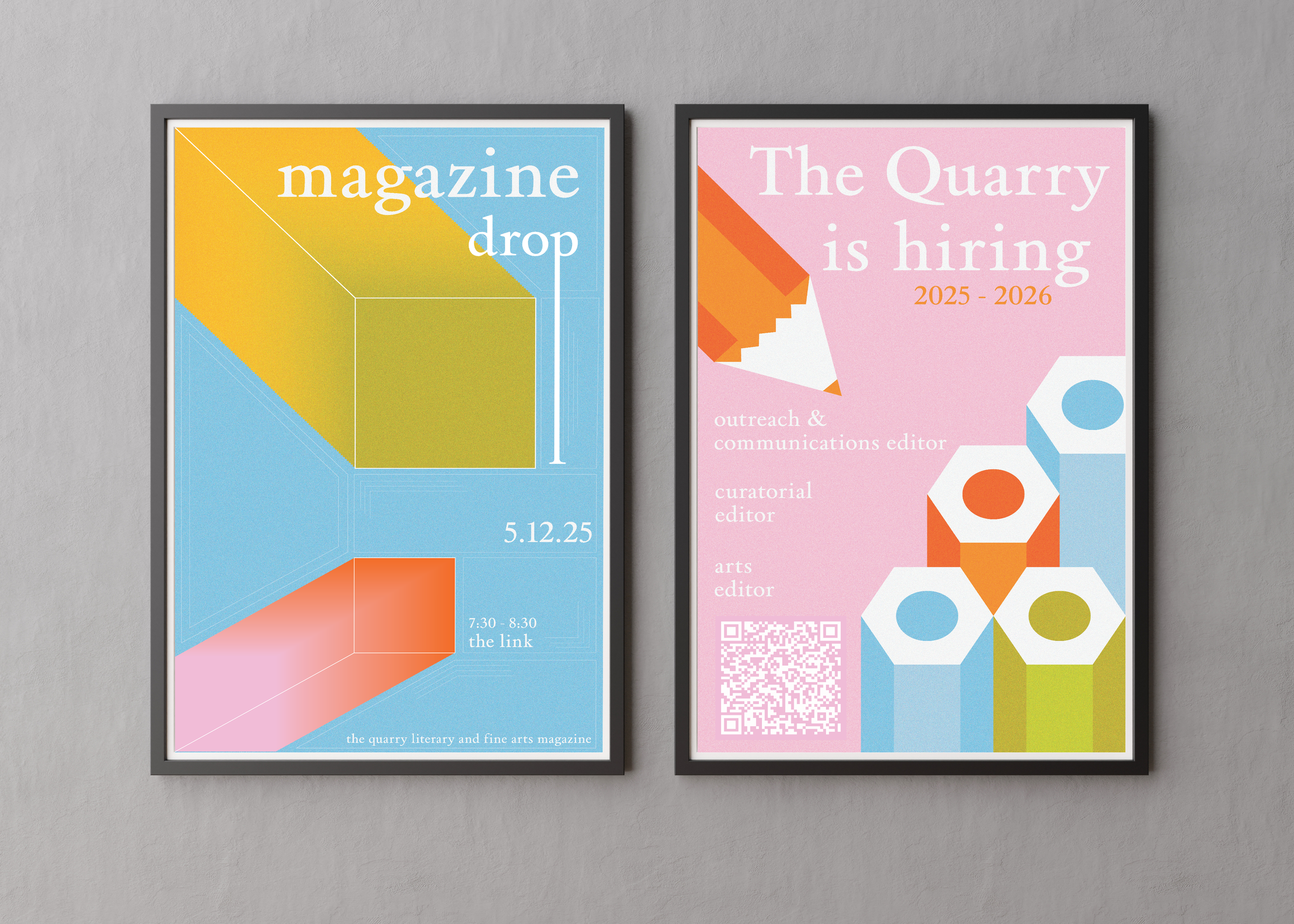Focused on bold, geometric shapes and imagery, the spring 2025 Quarry theme took a vibrant turn from the fall. Emphasizing repetition, texture, and simplicity, I designed the spring edition Quarry deliverables as a transformation from the 2024 theme, accentuating the spring’s Transitional States magazine and gallery.